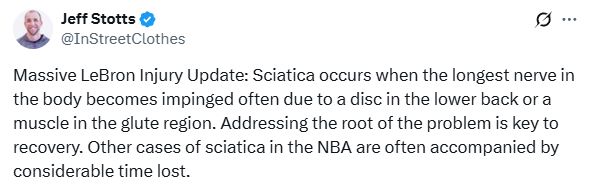 另一医学专家Jeff Stotts表示,勒布朗伤情重大更新:坐骨神经痛的发生是由于人体最长的神经受到压迫所致,压迫通常源于腰椎间盘或臀部肌肉问题。解决问题的根源是康复的关键。NBA中其他坐骨神经痛病例往往伴随着长期休战;NBA名宿纳什曾遭遇过这样的伤病。
