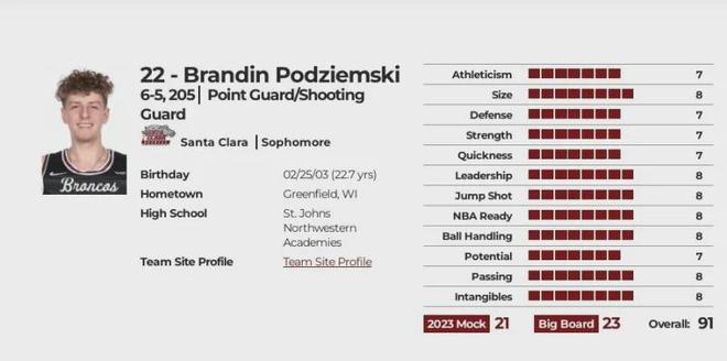 能力综合评分91分,预计选秀顺位首轮21-23顺位,实际选秀顺位首轮第19顺位,选秀模板德拉维多瓦。
