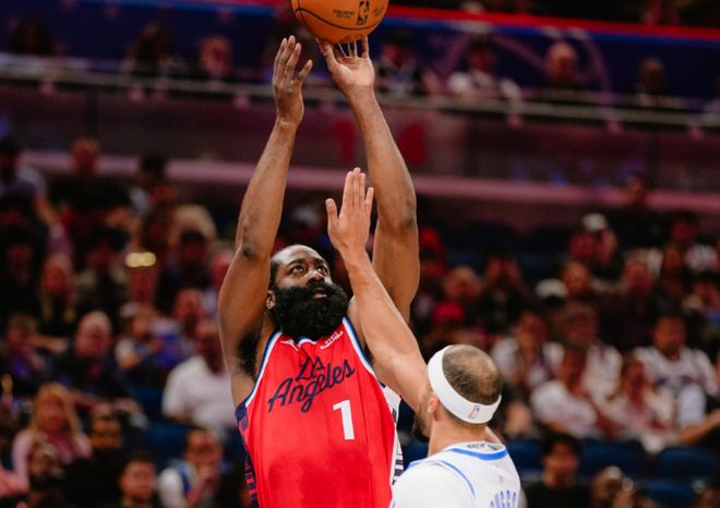 快船:莱昂纳德与比尔等缺席,哈登5记三分31分5篮板8助攻2抢断5失误,祖巴茨14分19篮板。