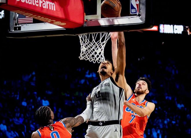 要从雷霆球队数据说起。本赛季雷霆场均得分123.1分联盟第二,场均控制失分106.3分联盟第一,百回合净效率值+16.5,NBA历史第一。在衡量赛程难度+球队表现统治力的SRS高阶数值中,雷霆的是夸张的+13.86,这比勇士和公牛鼎盛时期都要强。显然,上赛季亚历山大带队夺冠,已经让这一批年轻人从自信心上有明显提升,本赛季谁都可以缺阵,保持90%的胜率没问题,基本做到对95%的球队完成碾压级别的降维打击。那再回到和马刺的杯赛半决赛,我们聊几个小细节,就知道他们的名声如何了。