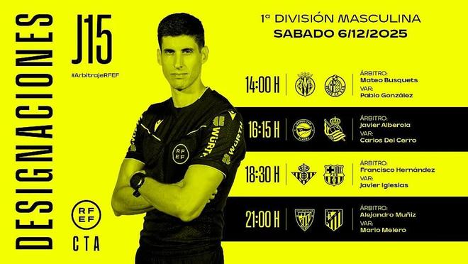 西班牙足协官方公布了本周六西甲四场比赛的裁判安排,弗朗西斯科-埃尔南德斯将执法巴萨客战贝蒂斯。