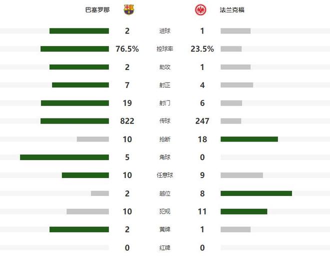 场面略显被动的法兰克福,在第21分钟率先打破场上平衡,布朗反击中带球杀到中场,随后一脚挑传,将球交给了中路前插的克瑙夫,后者扛住防守球员杀到巴萨腹地,然后一脚低射建功,帮助法兰克福取得了1-0的领先,连续九场丢球,也追平了巴萨欧冠最长丢球纪录。